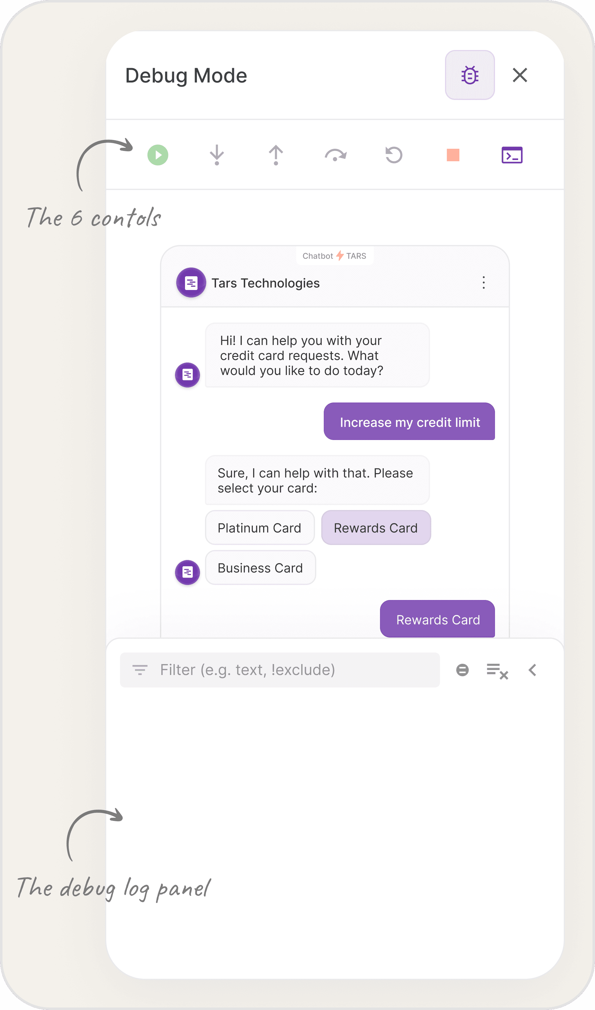 Step into would let a user drill into a single gambit's internal logic, testing each input separately. Step out returned to the main flow. Step over skipped a gambit and moved the debugger forward. A terminal log panel sat beneath the canvas, surfacing error output the way a code editor does.