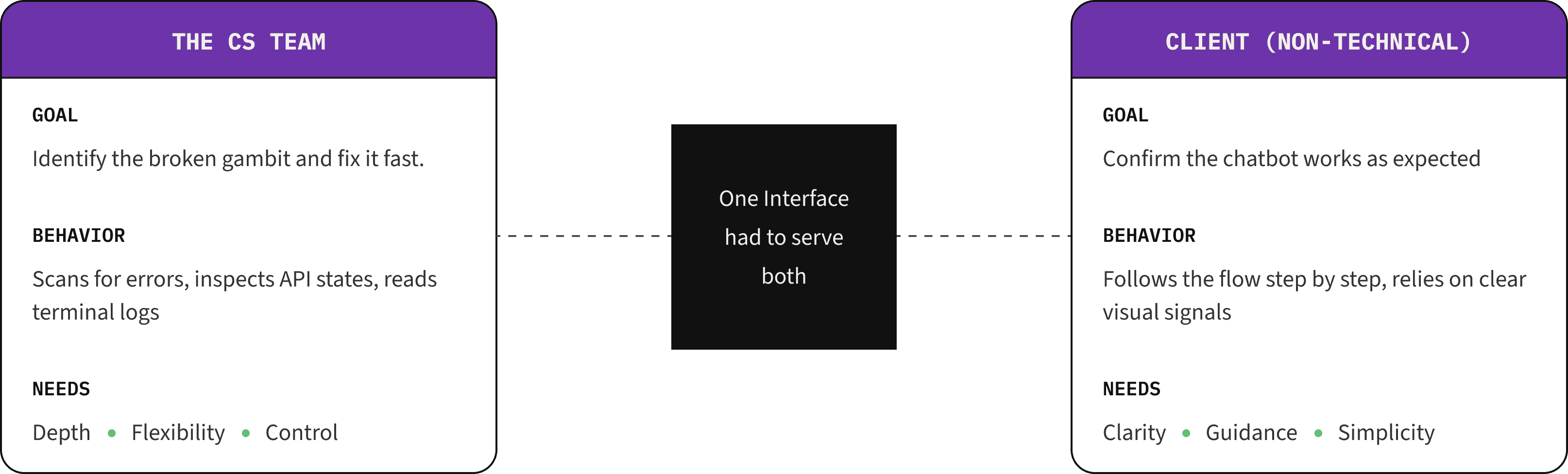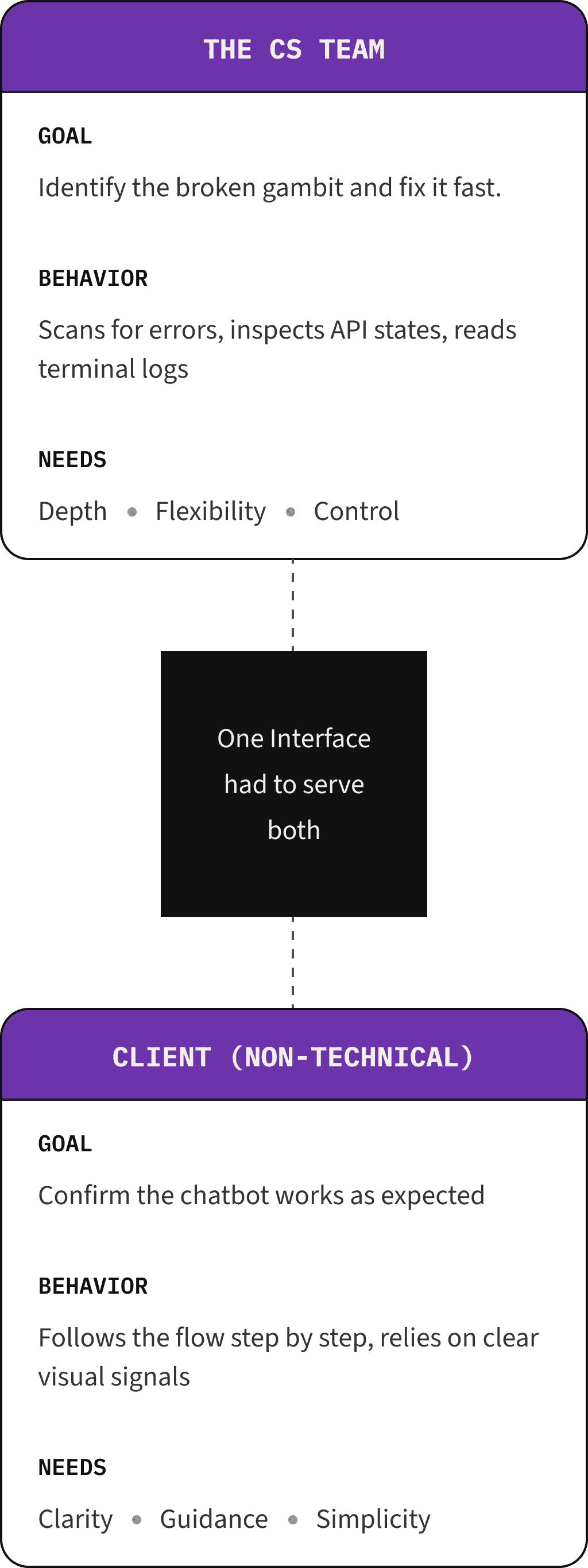 The constraint that emerged with this project was non-negotiable. I needed to design one interface that could work for the CS team (who could read API errors and JSON) while also eventually scaling to clients with no technical background. Two completely different mental models supported by one feature.