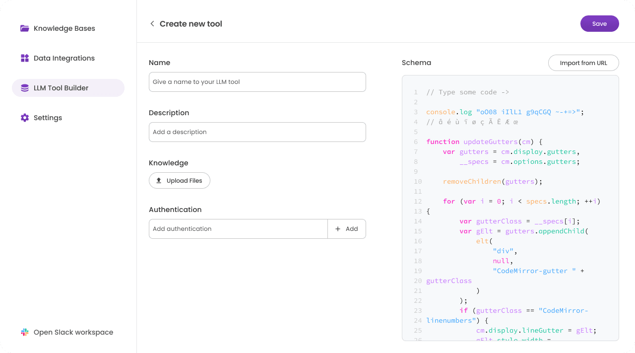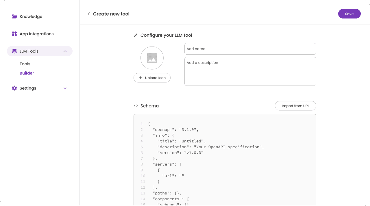 The design evolved through several iterations as I explored different layouts and levels of LLM configuration, while ensuring the experience remained understandable for non-technical users. The first version allowed teams to add custom tools by configuring the tool’s schema and authentication.