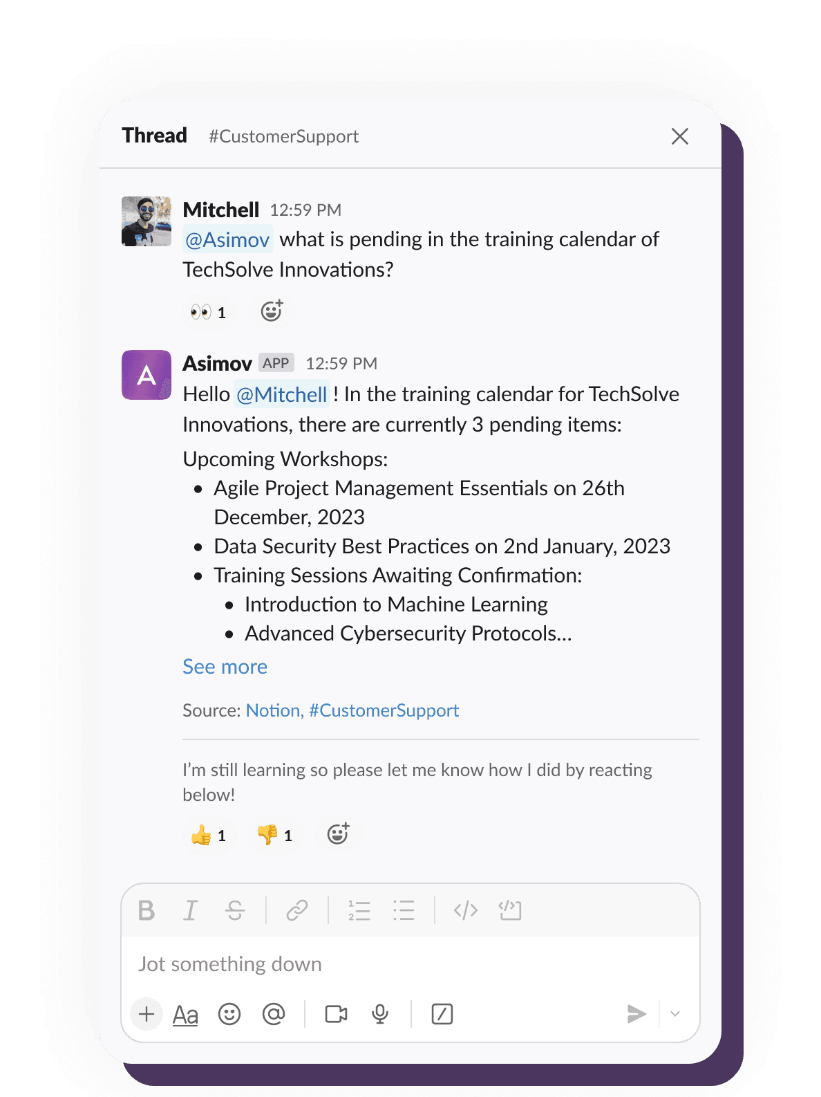 Example of Asimov retrieving information from connected knowledge sources and presenting it in a structured response within Slack.