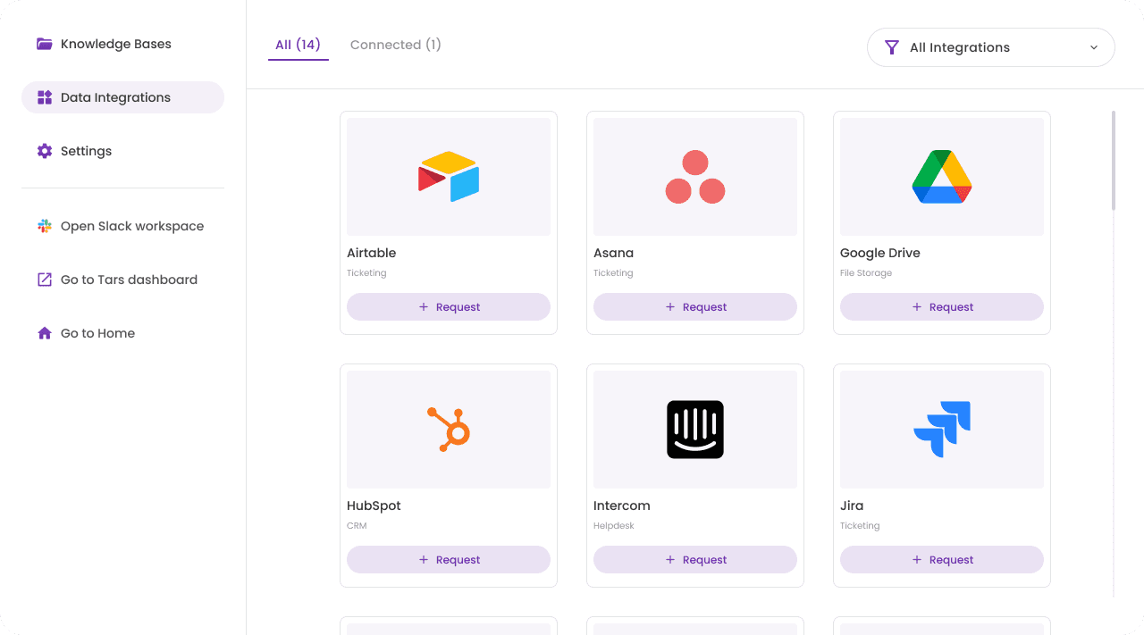 Beyond knowledge retrieval, Asimov also needed awareness of the tools teams used in their day-to-day workflows. Through the integrations hub, administrators can connect platforms such as Google Drive, HubSpot, and other internal systems.